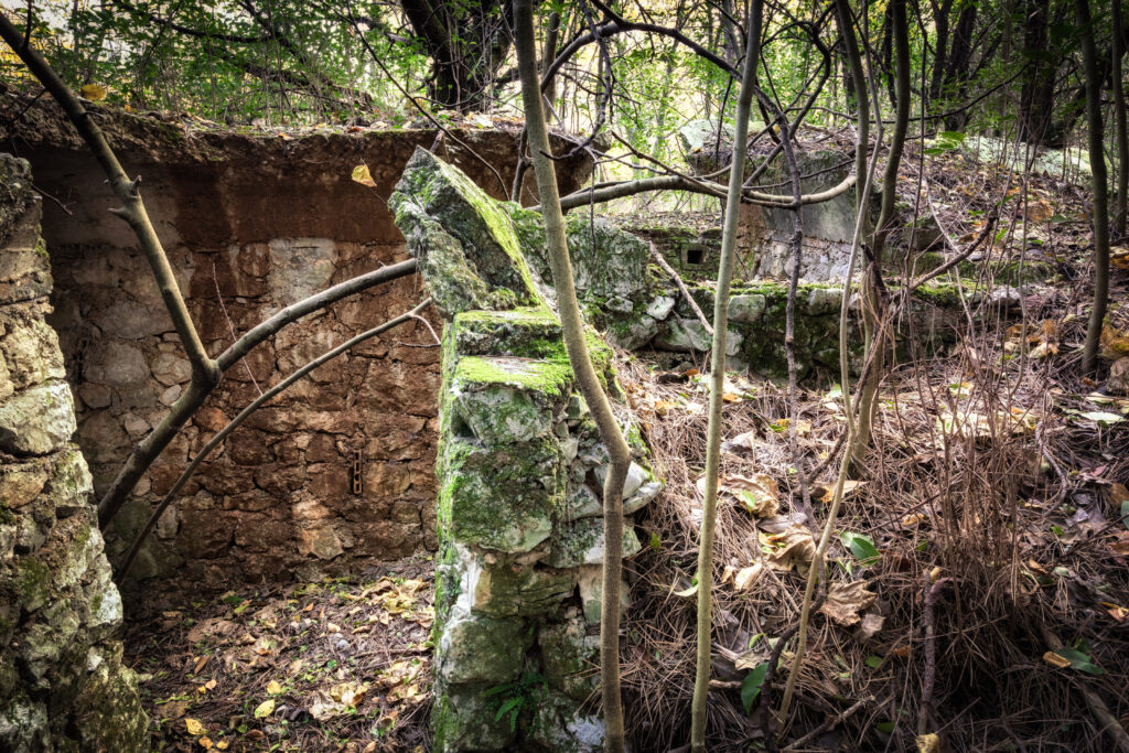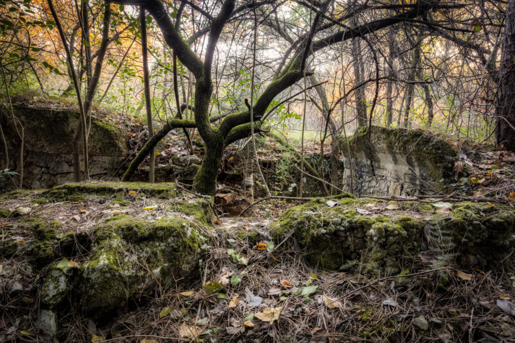 La bellezza pacifica dell’ambiente naturale e le rovine consumate dal tempo, simbolo di un periodo di violenza e distruzione, raccontano la storia di un silenzio ora interrotto solo dal vento tra gli alberi e il fruscio delle foglie cadute, un silenzio che porta con sé l’eco di un lontano fragore di battaglia.